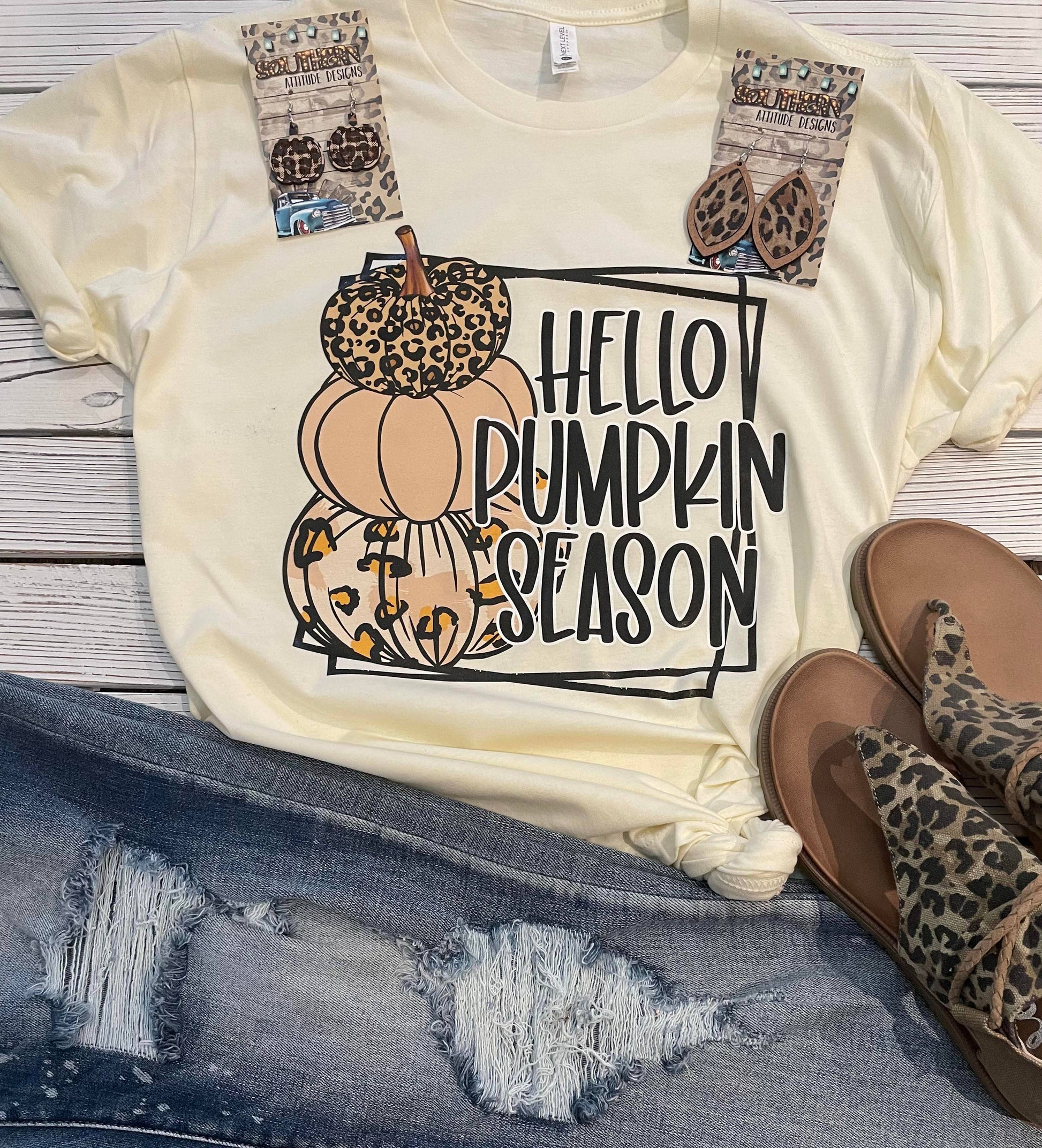 Wrap yourself in Fall fashion with this cozy "Hello Pumpkin Season" T-shirt! Perfect for long autumn days, it's crafted with soft fabric for an extra comfy fit. Wear it with your favorite jeans and boots and get ready for a spook-tacular season!